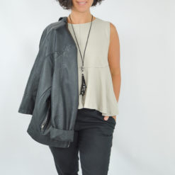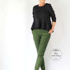 Da Minerva aus verschiedenen Stoffen genäht werden kann, wird auch die Passform variieren. Der am besten geeignete Stoff für diesen Schnitt ist ein Scuba. Die Minerva sitzt nicht eng unter der Brust, sondern eher locker. Im Allgemeinen sitzt das Peplum eher leger.